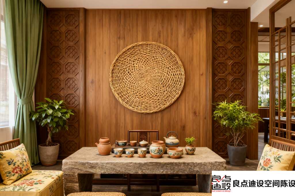正前方背景墻的圓形裝飾,寓意“圓滿”,古樸圖案配上對稱設計,中式美學穩穩拿捏。兩側展示架擺滿茶具和擺件,每一件都像藝術品,悄悄透露著店主的品味。軟裝里這種文化小物千萬別忽略——它們不占地方,卻能狠狠提升空間底蘊,讓客人都忍不住拍照打卡!