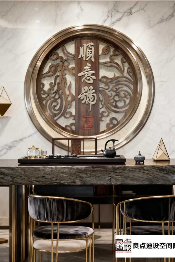 一進門,視線***被正中央的圓形木質雕花窗鎖死!深棕實木+做舊肌理,配上金色包邊,瞬間勾勒出新中式的骨架。中央“順意號”鎏***匾就像自帶追光,窗欞復刻傳統云雷紋,細節里還藏了個紅底印章小彩蛋——這種含蓄的文化表達,真的狠狠戳中懂行的寶!