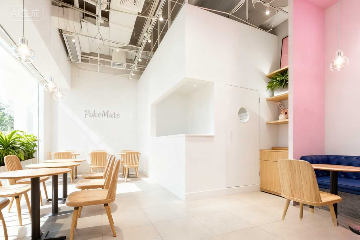 這家的細節處理真的絕了!粉色海報上那句"Poke Makes My Day Everyday"簡直寫到打工人心坎里,旁邊兩個菠蘿造型的容器也太可愛了吧!***妙的是那把隨意掛著的尤克里里,波西米亞風的隨性感一下子就出來了。暖黃色燈泡這么一打,水泥墻都變得溫柔起來,氛圍感直接拉滿~