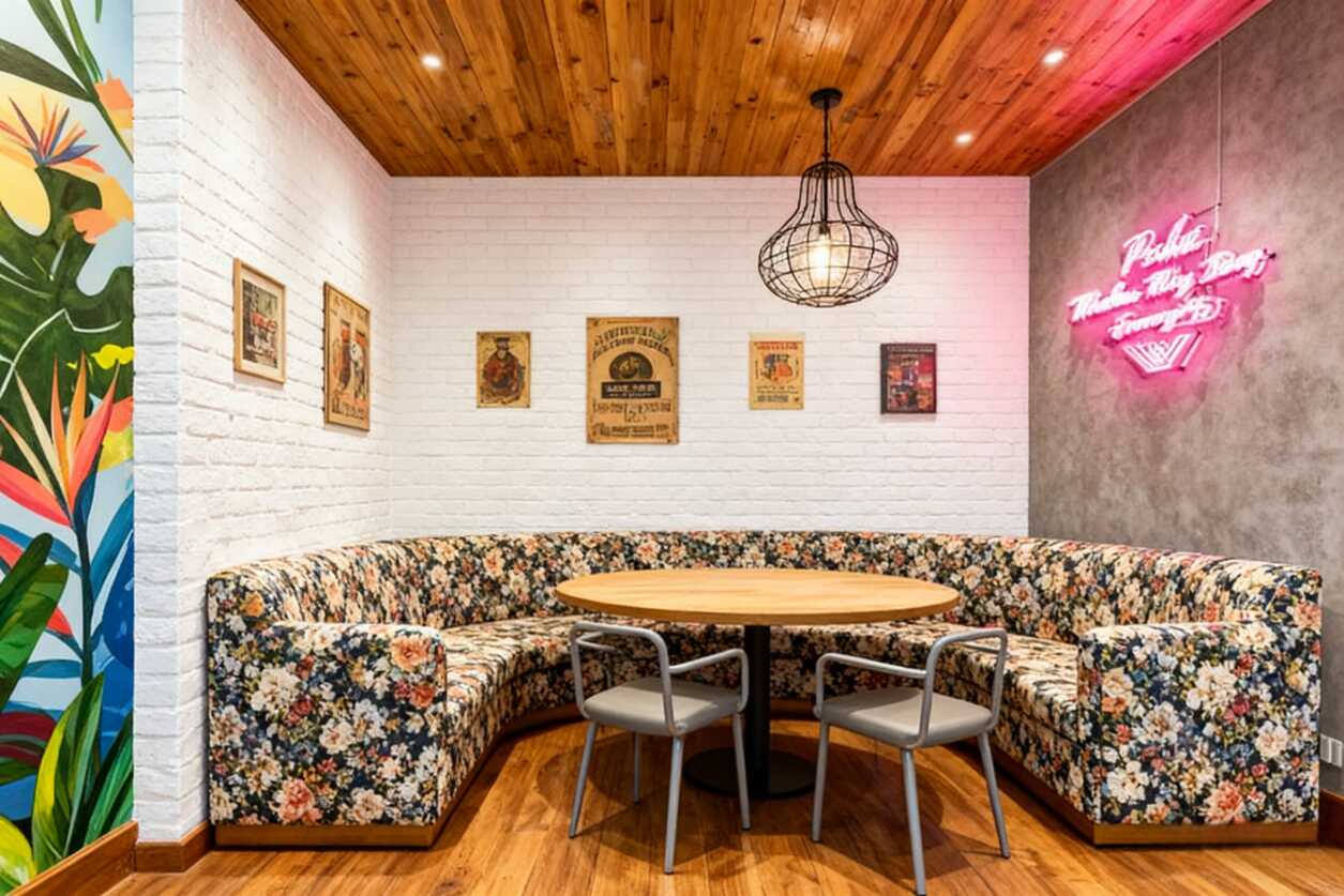雖然元素多,但主色調(diào)其實很克制:地毯的暖色、沙發(fā)的藍、綠植的綠,再點綴一面吸睛的粉紅霓虹墻——“EAT GOOD FEEL GOOD”標語直接點題,復古俏皮還能引導顧客拍照傳播。這波操作,老板***是懂營銷的!