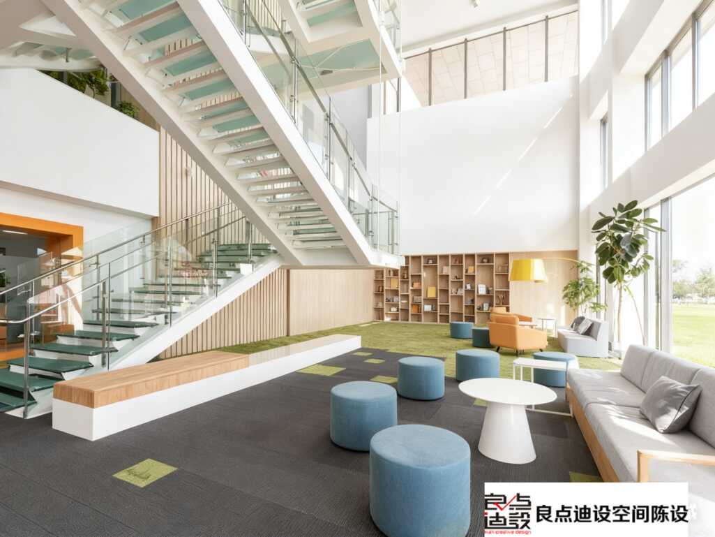 點睛色:企業品牌色(藍/綠)用在LOGO墻或單椅上,瞬間激活空間。