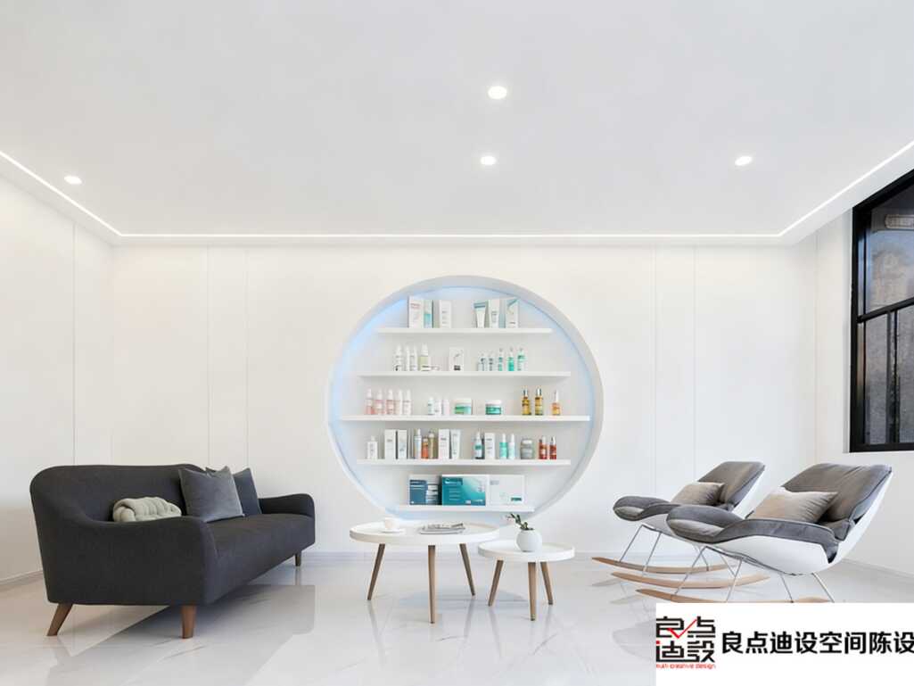 重頭戲當(dāng)然是護(hù)理區(qū)。兩張美容床被米白色的床罩妥帖覆蓋,面料看起來就親膚滿分。***點(diǎn)睛的是那面金色邊框的鏡子!它可不是普通的鏡子,簡直是“顏值放大器”,金屬的精致感一下子跳脫出來,和整體的白、米白形成細(xì)膩的層次。鏡子旁邊,一個(gè)原木色的置物架安靜佇立,上面整齊陳列著瓶瓶罐罐。木質(zhì)元素的加入,瞬間注入溫度,平衡了空間的清冷,還超級實(shí)用。