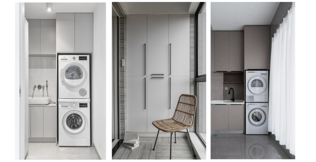 陽臺很重要的一個功能就是洗衣晾曬,因此洗衣機,烘干機,洗衣臺面都是必不可少,生活比較小資的業主,可以在陽臺定做一個卡座或者放幾把椅子還有一個小圓桌,趁著周末約幾個好友閑坐喝茶聊天,也是非常愜意的。