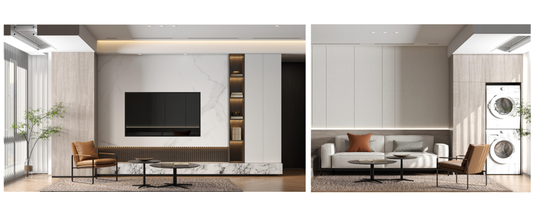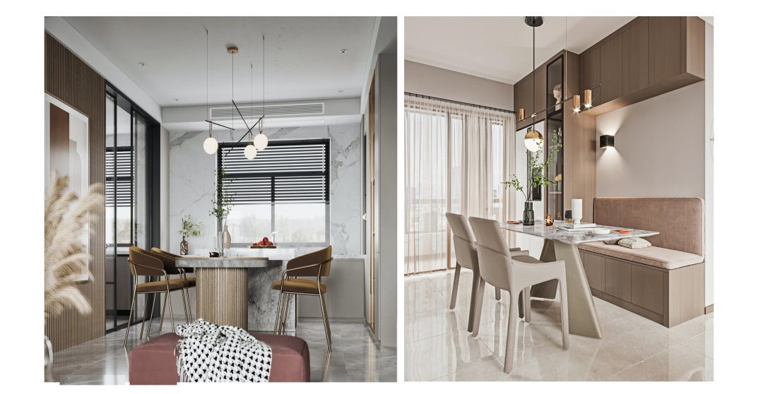 與***稿方案有所不同的是,將客廳陽臺空間打通,整體空間更加開闊;餐廳增加卡座,卡座一般靠墻或在角落,其占用空間比椅子少,必要時可以坐更多的人,還能增加收納空間。北次臥作為客臥,設計為榻榻米+衣柜+書桌結合的形式。