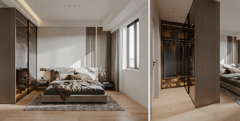 在房頂凹槽處做燈帶設計代替原有的主燈,實現極簡大方的燈具設計,讓整個房間簡潔明亮,視覺上房間更加寬敞,L型透明衣柜,在臥室中形成了小型衣帽間,同時能作為隔斷,分隔洗浴區和睡眠區,茶色的透明玻璃柜門提升空間的通透感,實用又高級,拿取衣服更加方便,更有一種精致的高級感,讓衣柜中的衣服成為一種展示品,美觀與實用兼具。