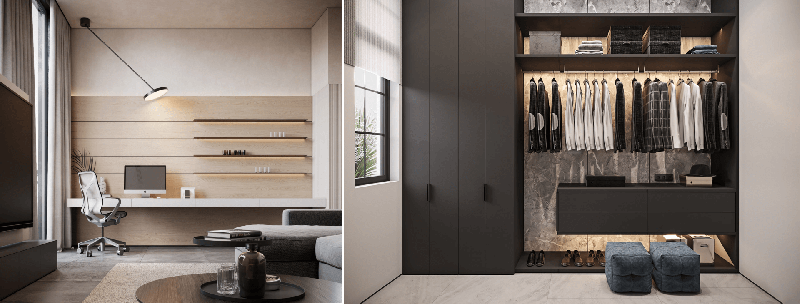鑒于北次臥空間有限,將北次臥做書房+衣帽間二合一的設計,一側做靠墻書桌,另一側做到頂衣柜設計,學習儲物兩不誤,家中儲物空間充足時,可以將衣柜改造成整墻的書籍收納,將整個空間變成書房,空間獨立不受打擾。