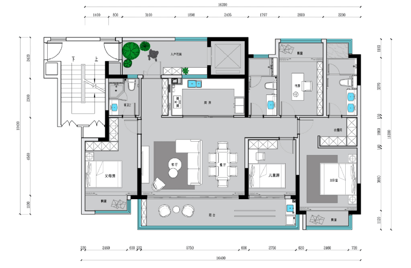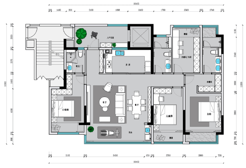 四間臥室,三間朝南,采光充足,父母房中帶有獨立衛浴,方便老人起夜,衛生間更是要做適老化設計,方便老人居住和使用,沿墻面定制的L型收納柜,***利用拐角空間,收納功能強大。兒童房帶有飄窗,視覺效果寬敞,改良采光,讓房間更加明亮,稍微裝飾下,鋪幾個蒲團,坐在午后的陽光里,看書喝茶擼貓。主臥中L型衣柜設計,形成獨立的小型衣帽間,浴室中兩個盥洗盆設計,方便男女主人早上上班時,不會出現匆忙爭搶的現象。朝北臥室設計成衣帽間和書房,解決家中收納問題,同時也提供了獨立安靜的學習工作空間。