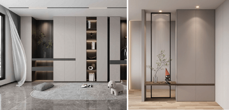 入戶玄關讓人眼前一亮,鞋柜底部留空,放鞋方便又美觀,鞋柜底部可以安裝聲控燈帶,拿取鞋子會更加方便,同時,聲控燈帶也能給生活增加更多的趣味性,把換鞋凳組合到鞋柜里,做成一體的設計既能保持空間的美觀簡潔,又能方便換鞋,也是一種比較流行的設計,鞋柜中間留空,隨手置物很方便,也能讓玄關顯得沒有那么擁擠。