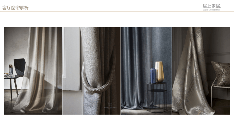 客廳窗簾的顏色***好從沙發花紋中選取,淺色調、透光性強的薄窗簾布料為好,能夠營造出一種莊重簡潔、大方明亮的視覺效果。