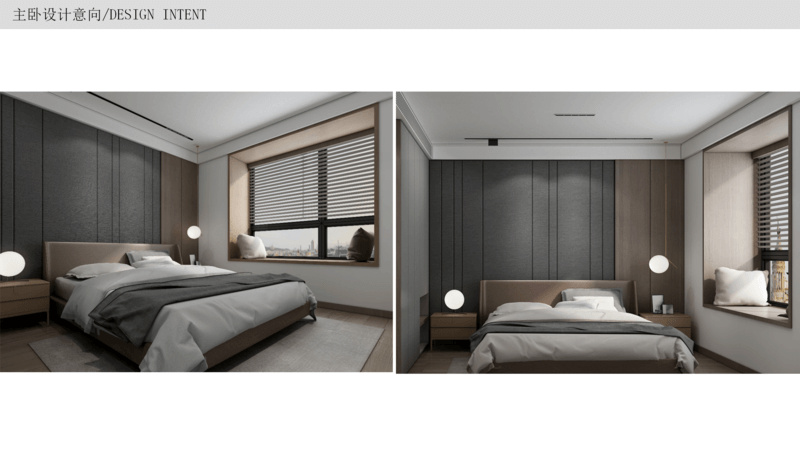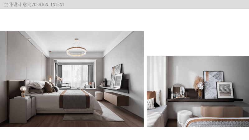 主臥 交付時帶有飄窗,可以將飄窗位置利用起來,改造成一個mini的學習區,背景墻按照風格和喜好做硬包,在床尾設立斗柜和化妝臺,滿足女主人的日常需求,因為主臥帶衣帽間,所以收納已經足夠了,主要以裝飾和體驗感為主。