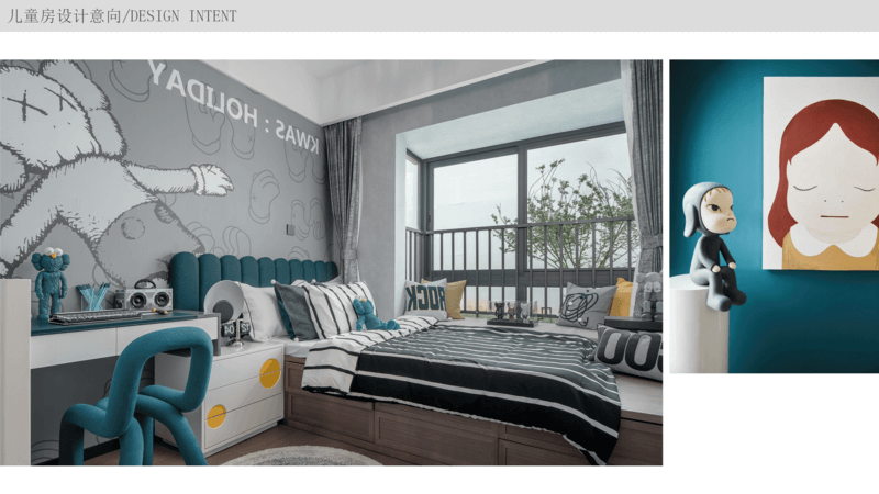 兒童房 主要以學習空間為主,用軟裝飾品來區分性別,如果業主孩子年紀較小也可以將這個房間當做親子互動區,小孩子都比較愛創造,那么可以設計一面黑板墻或者積木墻用來“亂涂亂畫”。