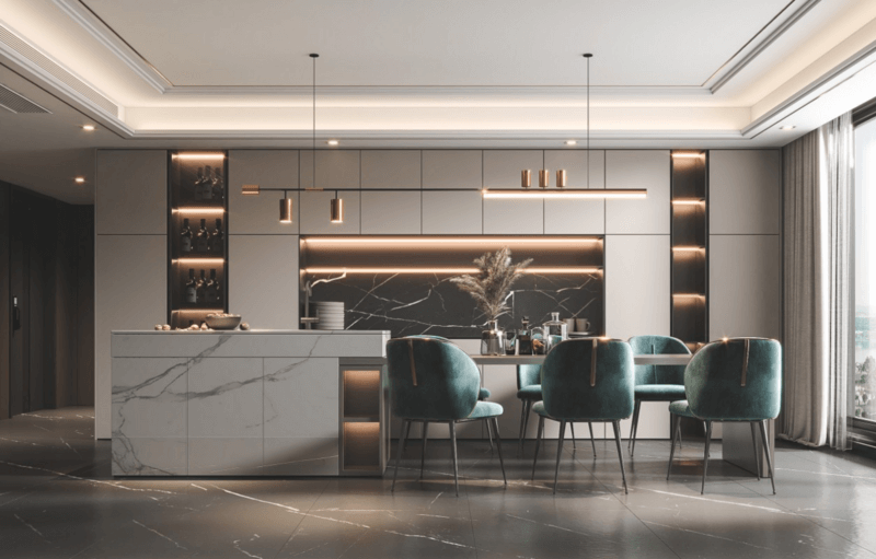 島臺的存在連接了餐廳和廚房,讓廚房不在是一個人的做飯空間,讓餐桌不再只是一個吃飯的地方,島臺集收納、料理、用餐與日常休閑和交流情感于一體,讓整個家庭氛圍更加的和諧。