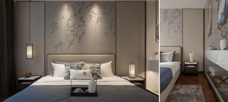 次臥相比主臥要小很多,利用床頭墻面,打造收納+書柜一體化定制床頭柜。打造沉穩(wěn)、淡雅、溫暖的感覺, 忌過冷、艷、暗、亮。