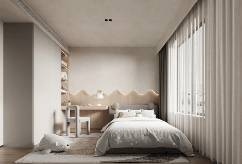 兒童房的設(shè)計,除了要營造一種天真爛漫的氛圍外,還需要有休憩功能、學習功能和收納功能;采用一體化的定制形式,將衣柜、書柜、書桌做一體化定制,***大化利用空間的同時,滿足多重需求。