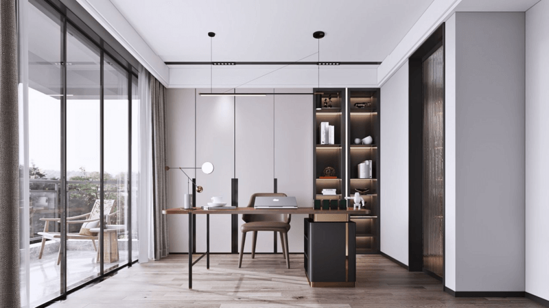 或者只作為獨立書房時需要規(guī)劃足夠的收納空間,靠墻定制書桌+書柜,可容納多人使用,便于工作學習。開放式與封閉式并存的書柜,既可以擺放書籍,也可以擺放裝飾品。
