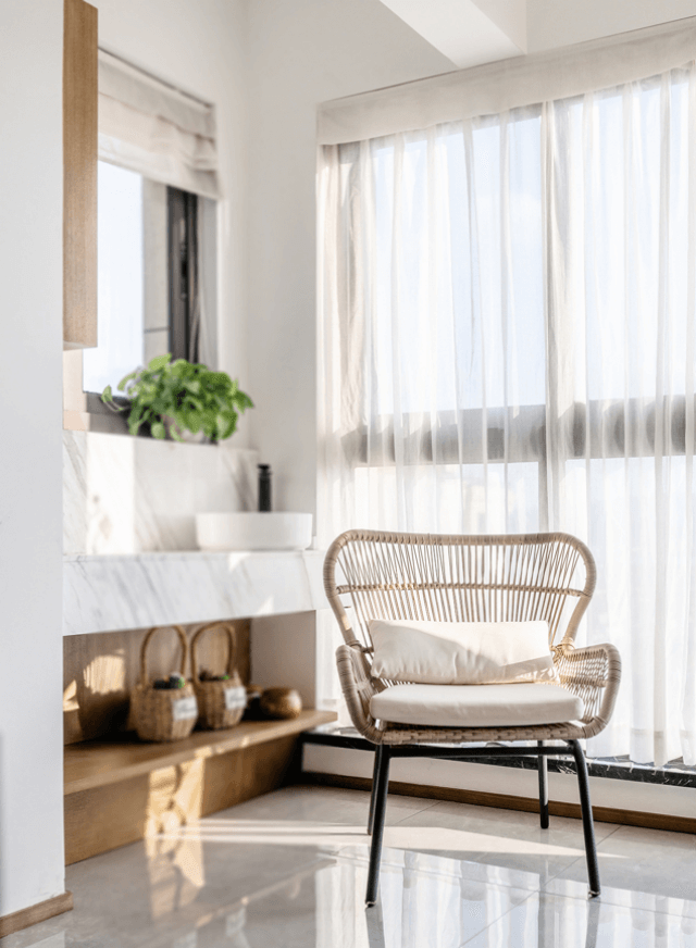 北陽臺作休閑使用。綠植、休閑椅、小茶幾構(gòu)建了一個小而精致的休閑角,是家中難得的放松空間。如果有好友登門也可來這里小坐,兩人喝喝茶、聊聊天,非常悠閑。