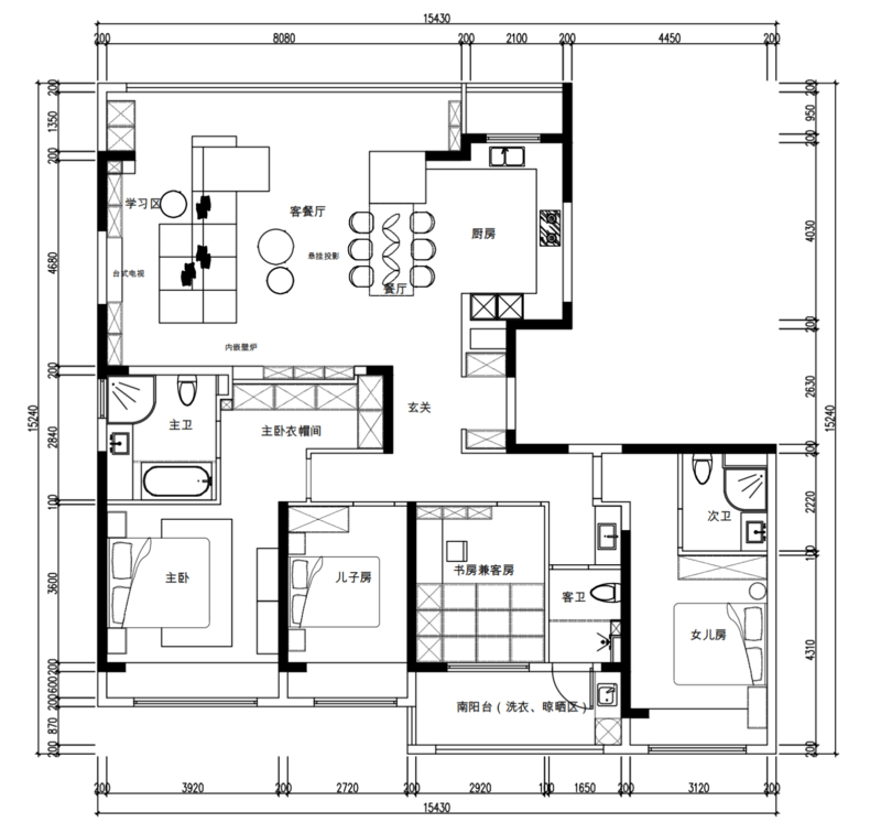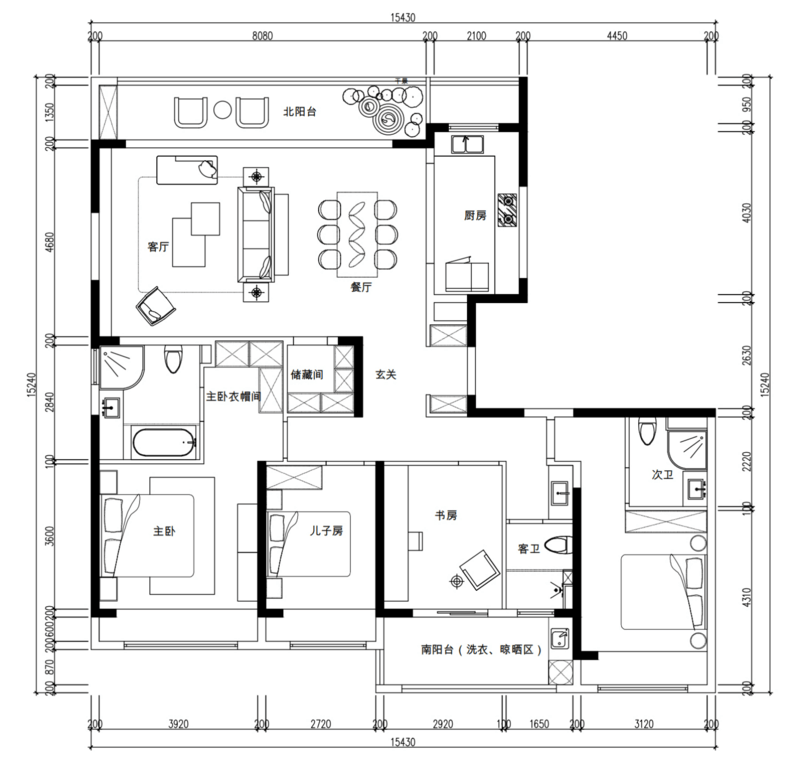 因為這個戶型南北都有陽臺所以南陽臺主要用作洗衣晾曬,北陽臺作為休閑區(qū),種種鮮花綠植等。四個房間均朝南,保留其中三間臥室均帶有飄窗,居住起來比較舒適,兩間作臥室套房,一間為主臥,另一間可以作為長輩房,使用起來更加方便;兒子房靠近書房,臥室比較小,只做基礎(chǔ)的收納和滿足睡眠需求,學習主要在書房完成,提高空間的使用頻率。