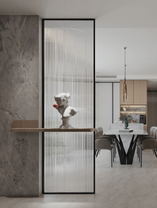 進門看見的是客廳,可以兩邊靠墻做頂天立地式收納柜,打造一個兼具美觀與實用的入戶空間,既能提升家的顏值,又能為家打造一個功能區(qū)。如果不考慮儲物,就可以用玻璃作為隔斷。玻璃隔斷不會影響室內(nèi)采光,還有增加室內(nèi)通透感的作用。