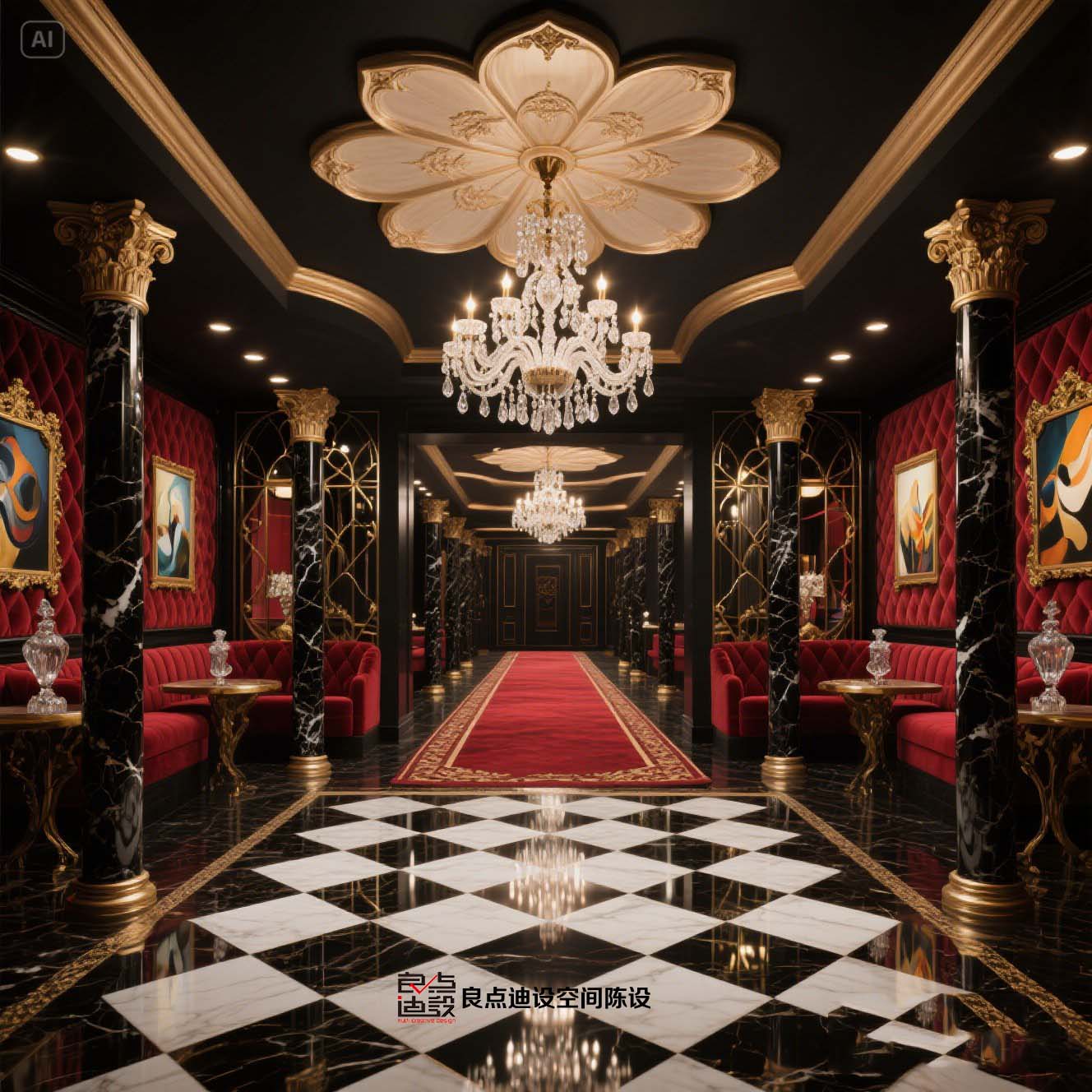 酒吧軟裝教科書!黑金穹頂+紅絲絨沙發裝修軟裝設計直接封神