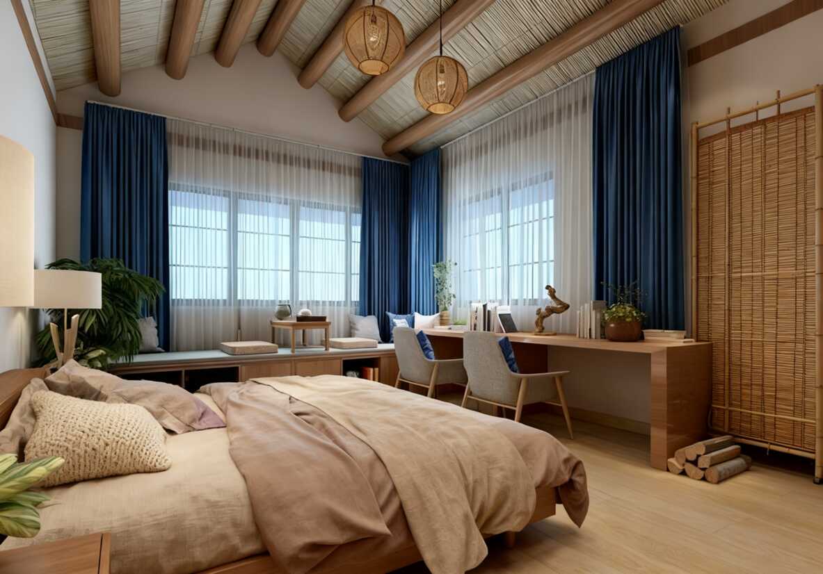 先說這空間的 “骨架”,裸露的木質房梁、通體原木的衣柜和書桌,瞬間把自然感拉滿。但軟裝才是靈魂啊!