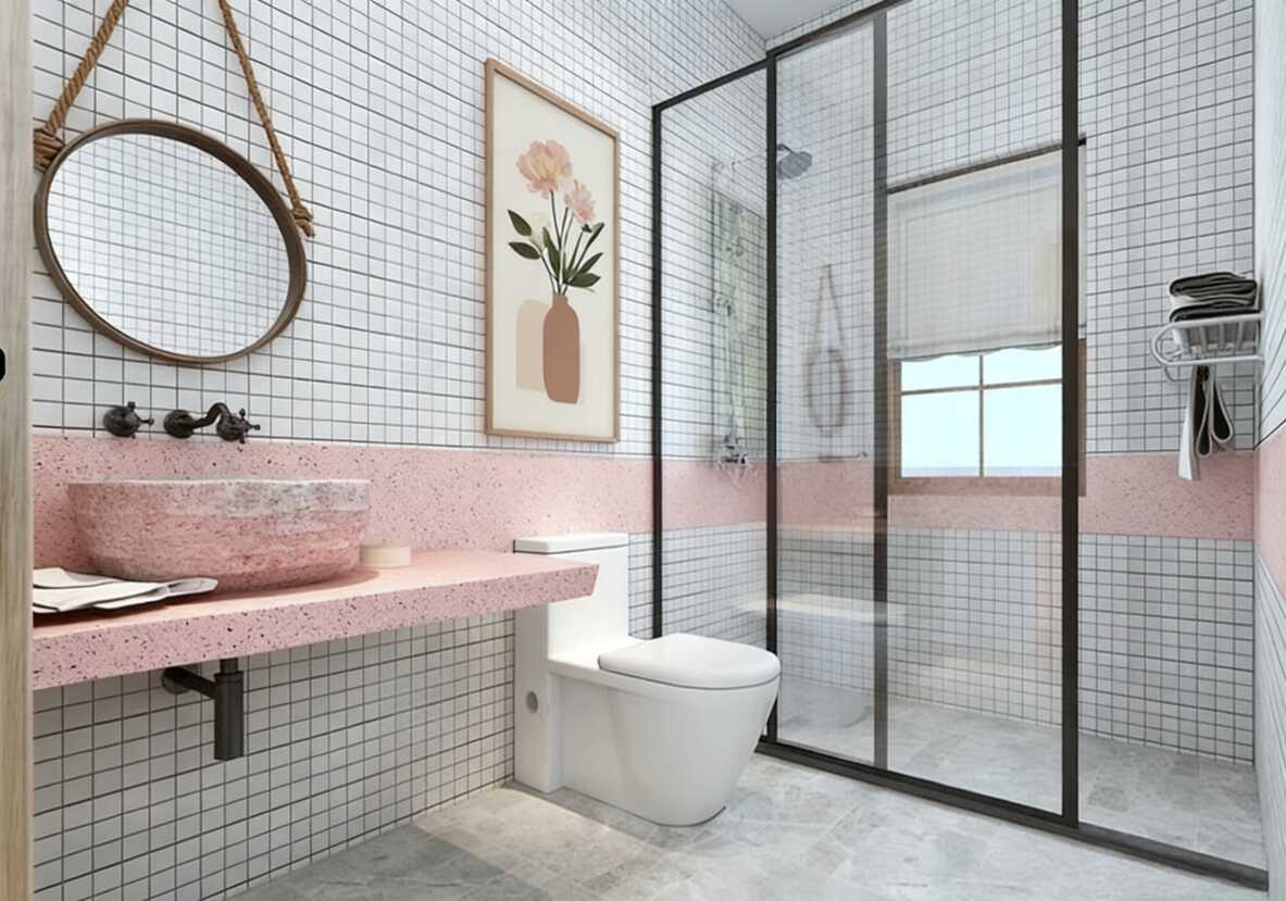 少女心暴擊!這家民宿浴室軟裝設計太會了,粉白格紋 + 復古細節,洗澡都像在打卡